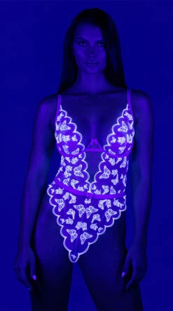 Straps and net create the sexiest details on this alluring teddy featuring criss-cross strappy elastic cups, adjustable shoulder straps, a hook back closure with a keyhole, a sheer mesh bodice with a triangular cut-out, solid waist panels, and a thong cut back.