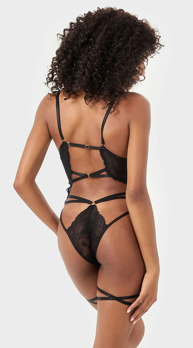 Have your babe hypnotized in this seductive lace teddy featuring sheer underwire cups with a scalloped trim, spaghetti straps, a sheer bodice with cut-out sides, an open strappy back, attached adjustable garter straps, adjustable wraparound leg garters, metal O-ring accents, and a strappy cheeky cut back.