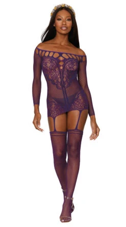 Spice up your romantic affairs in this seductive bodystocking dress featuring an off-the-shoulder neckline with wide net detailing, 3/4 length fishnet sleeves, a sheer lace and fishnet bodice with small net center panels, garter straps, and matching attached thigh high stockings. (Panty not included.)