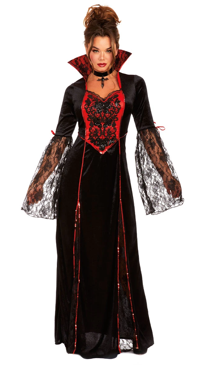 Scream away! Hypnotize the victim of your choice in this Gorgeous Ghoul costume featuring a velvet collared gown with a flared skirt with lace insets, a center front applique with sequin accents and lace trim, delicate lace sleeves, red sequin piping, and a gothic cross necklace.