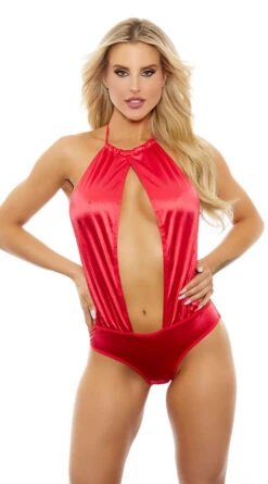 Tempt and tease in this provocative teddy featuring a high neckline, halter straps, a loose bodice with an open center panel, an open back, and a cheeky cut back.
