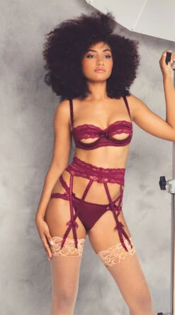 Feel the excitement in their touch with this stunning bra set featuring satin shelf cups with a peek-a-boo lace trim, adjustable spaghetti straps, satin bow accents, a sheer back band with a hook and eye closure, a matching lace garter belt with adjustable garter straps, and a matching cage panty with a strappy lace open back. (Stockings not included.)