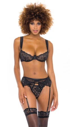Are you feeling sweet or sexy? No need to choose in this eye catching bra set featuring strappy vinyl underwire cups with adjustable spaghetti straps, a caged back band with a hook closure, a matching high waisted garter belt with O-ring accents, wraparound leg garters, and a matching double strap thong. (Stockings not included.)