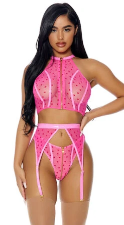 Take control of your desires in this sultry mesh set featuring a sheer high neck top with a front zipper closure, an allover heart design, vinyl piping details, a matching high waisted garter belt with a hook and eye back closure and adjustable garter straps, and a matching panty with a front zipper closure and a thong cut back. (Thigh high stockings not included.)