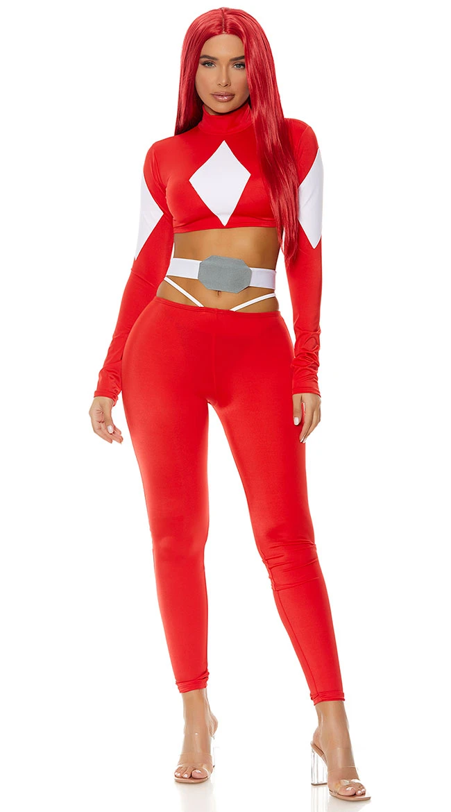 You’re the leader of the pack! Morph into one hot superhero in this Powerful One costume featuring a red long sleeve mock neck crop top with a contrast diamond print detail, matching leggings with white hip straps, and a belt with a silver center patch. (Wig and shoes not included.)