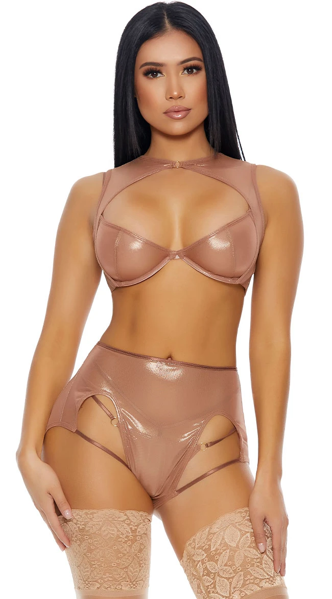 How low can you go? Share your sparkle in this intricate bra set featuring sheer glitter mesh underwire cups with a high neck keyhole cut-out, thick shoulder straps with a hook back of neck closure, and a matching high waisted panty with strappy exposed sides, a thong cut back, and booty framing straps. (Stockings not included.)