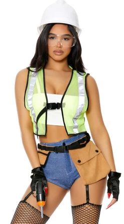 Grab your toolbelt you’ve got a job to do! You’ll be well equipped to find a stud in this Under Construction costume featuring a white vinyl cami, a denim print bottom with attached garter straps, a fluorescent yellow mesh vest with a buckle closure, a matching belt with functional pouches, fingerless gloves, and clear safety glasses. (Hard hat, stockings, and tools not included.)