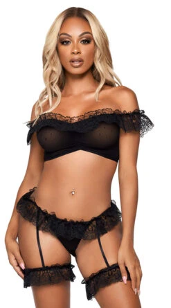Give your lover a sexy surprise in this flirty bra set featuring opaque, dotted mesh cups, an off-the-shoulder neckline with a ruffled lace trim, and a matching panty with an open crotch, an open back with booty framing straps, garter straps, and attached wraparound lace garters.