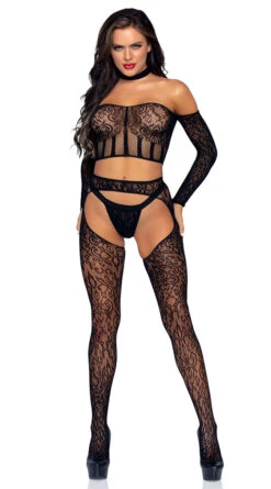 You’ll want just a taste of this sexy bodystocking set featuring an off-the-shoulder crop top with long sleeves, sheer lace cups, an attached choker detail with narrow back panel, matching crotchless suspender hose, and a daring g-string panty.