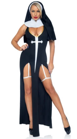 Say your prayers! Take an oath to be sexy in this Sultry Sinner costume featuring a black dress with dual slits, attached garter straps with wraparound leg garters, a white wet look cross detail, a collar, and a nun habit. (Shoes not included.)