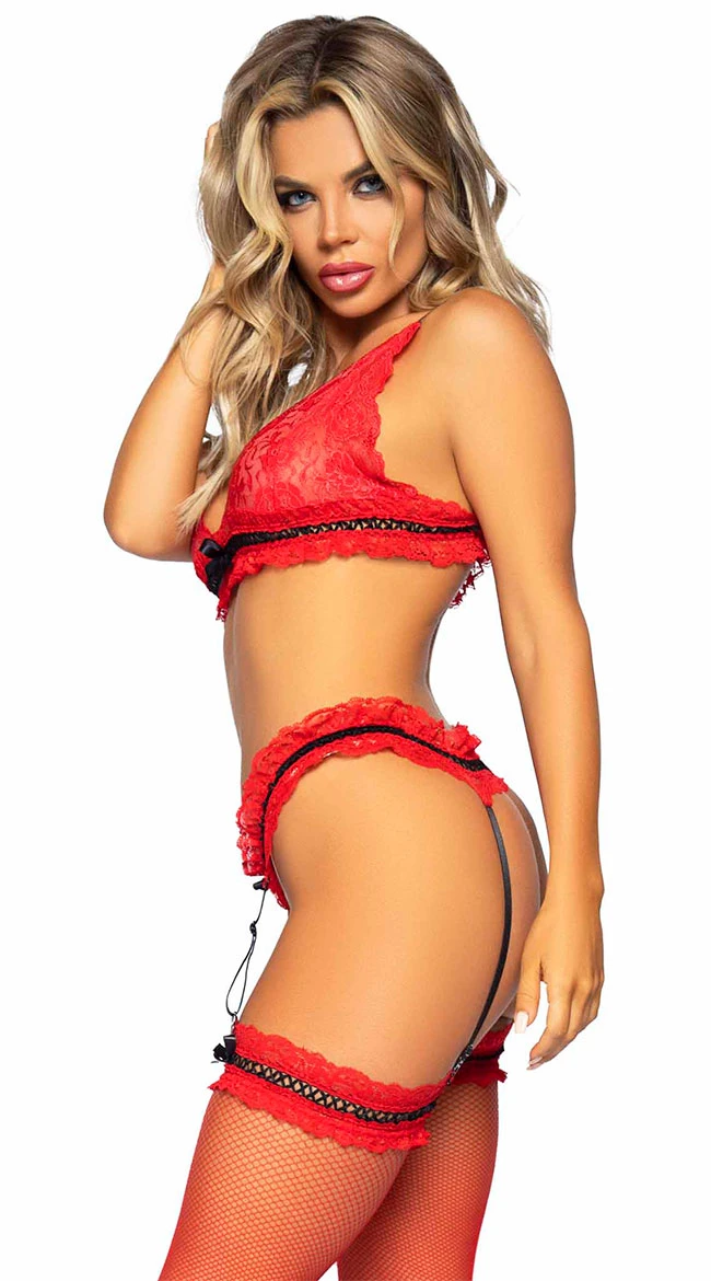 Lure your sweetheart straight to the bedroom in this sexy bra set featuring sheer lace cups with a scalloped trim, adjustable spaghetti straps, a hook and eye closure, a ruffle underbust within a net trim, satin bow accents, a matching garter panty with a thong cut back, and fishnet thigh high stockings.