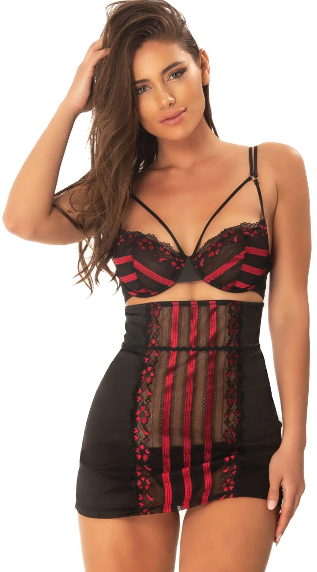 Take matters into your own sexy hands with this alluring fitted chemise set featuring a strappy neckline, molded underwire cups with a floral lace trim, an underbust cut-out, a sheer striped lace bodice panel with floral lace edges, adjustable spaghetti straps, double hook and eye back closures, back cut-outs, and a matching g-string.