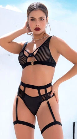 Dare to go somewhere new in this stunning bra set featuring striped sheer mesh cups with a strappy bust, metal O-ring accents, adjustable spaghetti straps, a hook back closure, a matching sheer stripe panty with attached garter belt, wraparound leg garters, and a cheeky cut back.