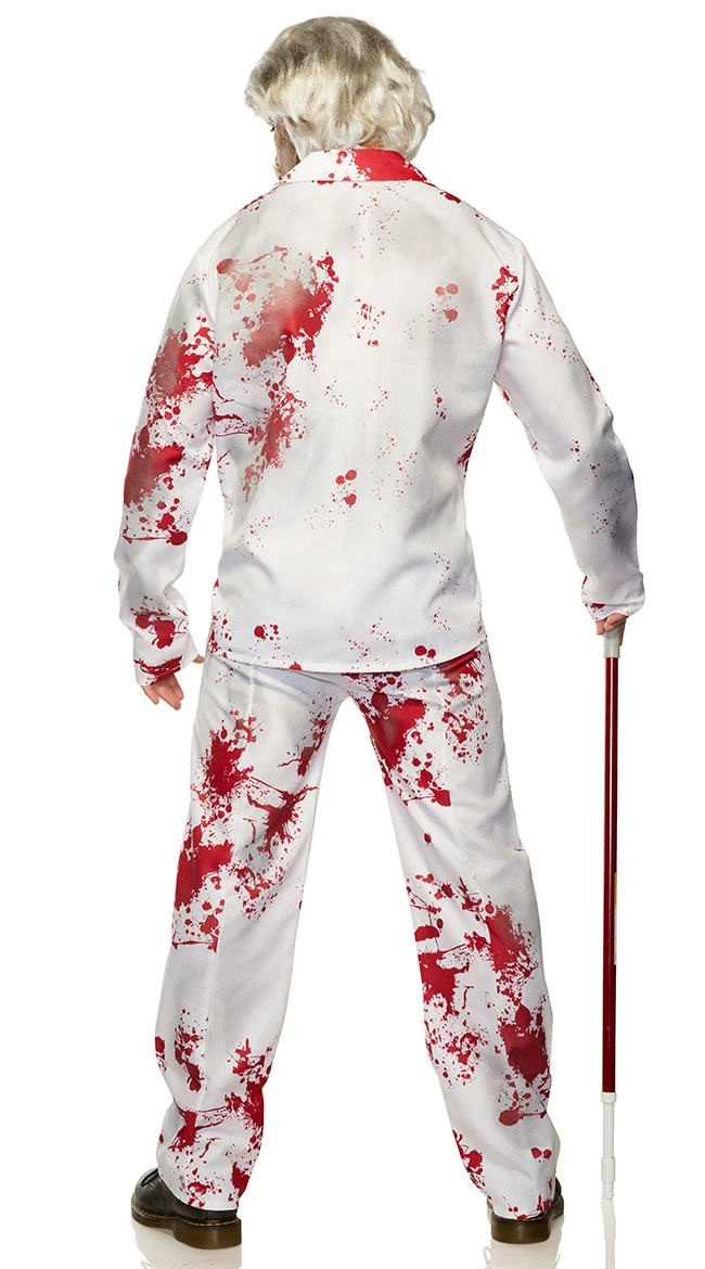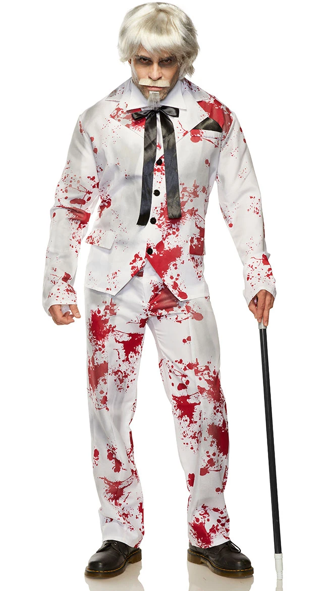 Your next victim looks finger lickin’ good! Send chills up their spine in this men’s Creepy Chicken Colonel costume featuring a white suit jacket with red blood details and a button front closure, faux pockets, an attached black pocket square, a white dickie, a black satin tie, and matching pants. (Wig, mustache, shoes, and cane not included.)