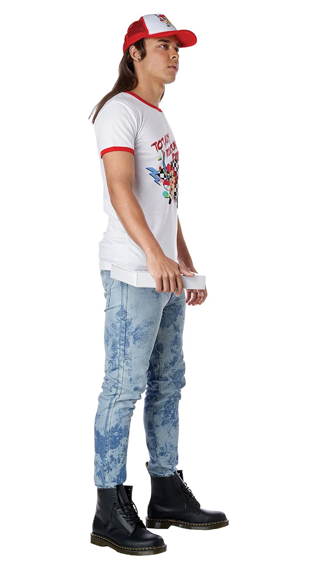 You’ve got a hot delivery just for them! Cure all their cravings in this Men’s Rockin’ Pizza Dude costume featuring a short sleeve white graphic T-shirt with a “Totally Rockin’ Pizza” screen print, a matching trucker hat with an attached mullet, and a pizza box. (Pants and boots not included.)