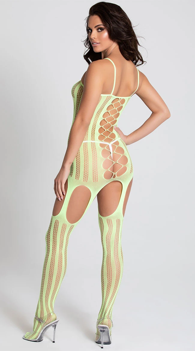 Set the sexy tone in this stunning bodystocking featuring sheer fishnet cups with strappy criss-cross center bodice details, spaghetti straps, attached string garter straps, an open crotch and rear, and attached thigh high stockings. (Panty not included.)
