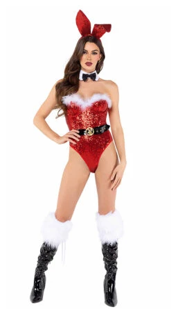 Spread red hot cheer, bunny babe. Hop right into the Holiday spirit in this Playboy officially licensed Holiday Bunny costume featuring a red sequin bodysuit with molded underwire cups, a white marabou trim, an attached belt with gold buckle logo, a collar and bow tie, a matching bunny ears headpiece, and furry white boot covers. (Boots not included.)