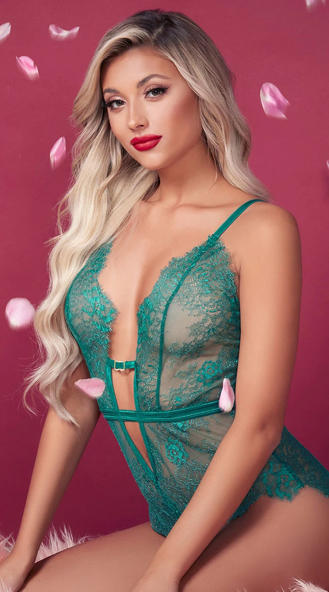 Lust for your sweetheart in this enticing eyelash lace teddy featuring sheer cups, a plunging neckline, a rhinestone charm accent, a sheer bodice with a satin waistband, a back keyhole with a satin bow closure, and a cheeky cut back.