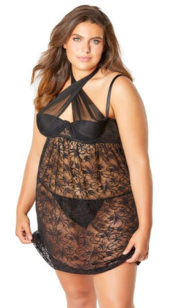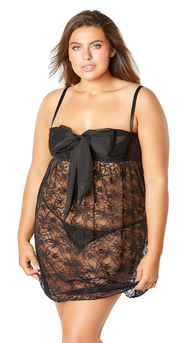 Be a seductive babe in this alluring plus size babydoll set featuring molded lace shelf cups with underwire, a multi-way tie front, adjustable spaghetti straps, a sheer lace bodice and skirt, a hook and eye back closure with a keyhole, and a matching g-string.