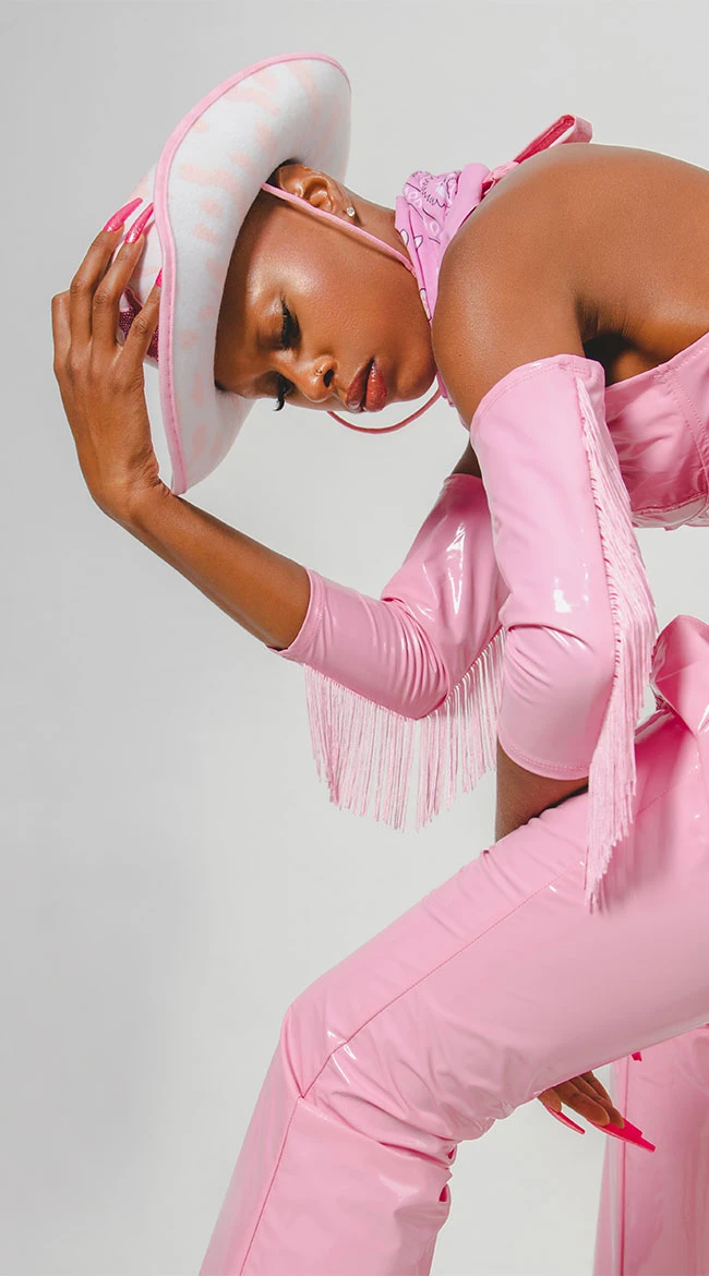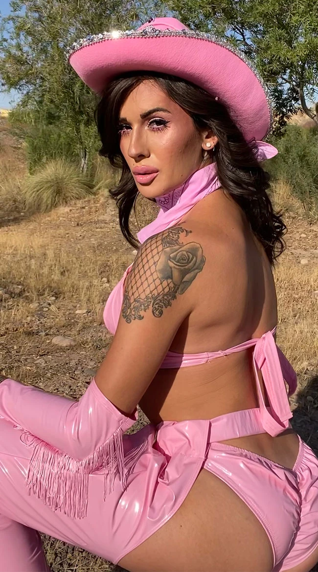 On Wednesdays, the western babes wear pink. Bring some sass to the rodeo with this All Dolled Up Sheriff costume featuring a pink vinyl bra top with halter ties, chaps with an adjustable buckle closure, matching booty shorts, fringed arm bands, and a pink bandana. So chic! (Cowgirl hat and shoes not included.)