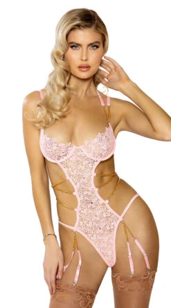 Spring into action in this sassy teddy featuring sheer embroidered lace underwire cups, double adjustable spaghetti straps with gold chain detailing, a narrow center bodice panel with chain accents, a strappy bottom, adjustable garter straps, and a g-string cut back. (Stockings not included.)