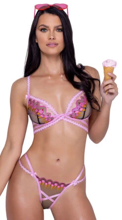 Give your lover a taste in this flirty bra set featuring sheer mesh underwire cups with a scalloped trim, strawberry ice cream embroidery, pink scalloped straps, matching adjustable spaghetti straps, satin bow accents, a strappy underbust, a hook and eye back closure, a strappy back hook closure, and a matching panty with criss-cross strap detailing, a double strapped waistband, “Lick Me” embroidery, and a thong cut back. (Sunglasses and ice cream not included.)
