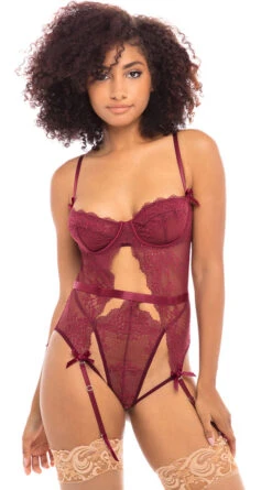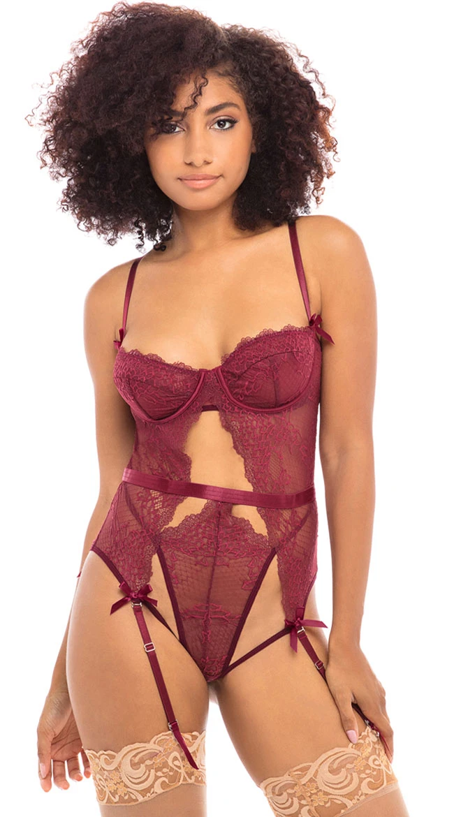 Show it off in a stunning new way in this sexy lace teddy featuring molded underwire lace cups, adjustable spaghetti straps, a cage back band with hook and eye closures, a split open front with an attached panty, a mid waist band with a hook back closure, adjustable garter straps, satin bow accents, and a g-string cut back. (Stockings not included.)