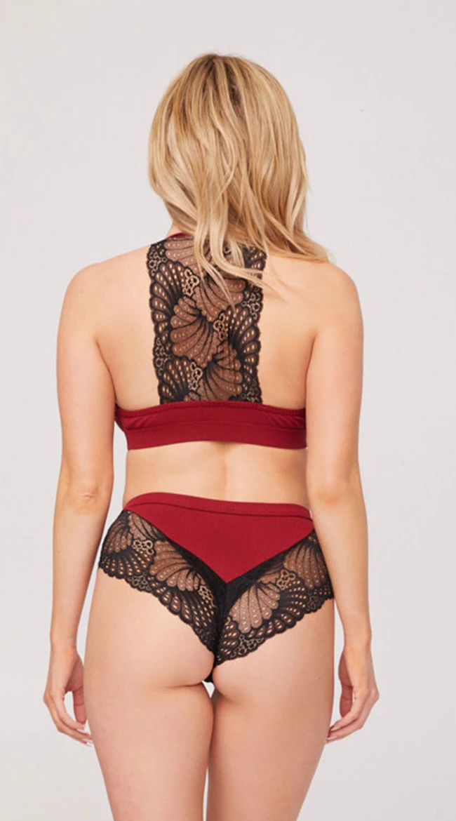 Snuggle up with your sweetie and get cozy in this exclusive lounge bra set featuring a soft ribbed bra top with a scoop neckline, black button accents, spaghetti straps, a sheer, black lace racerback, a burgundy back band, and a matching hipster panty with sheer, black lace panels and a cheeky cut back.