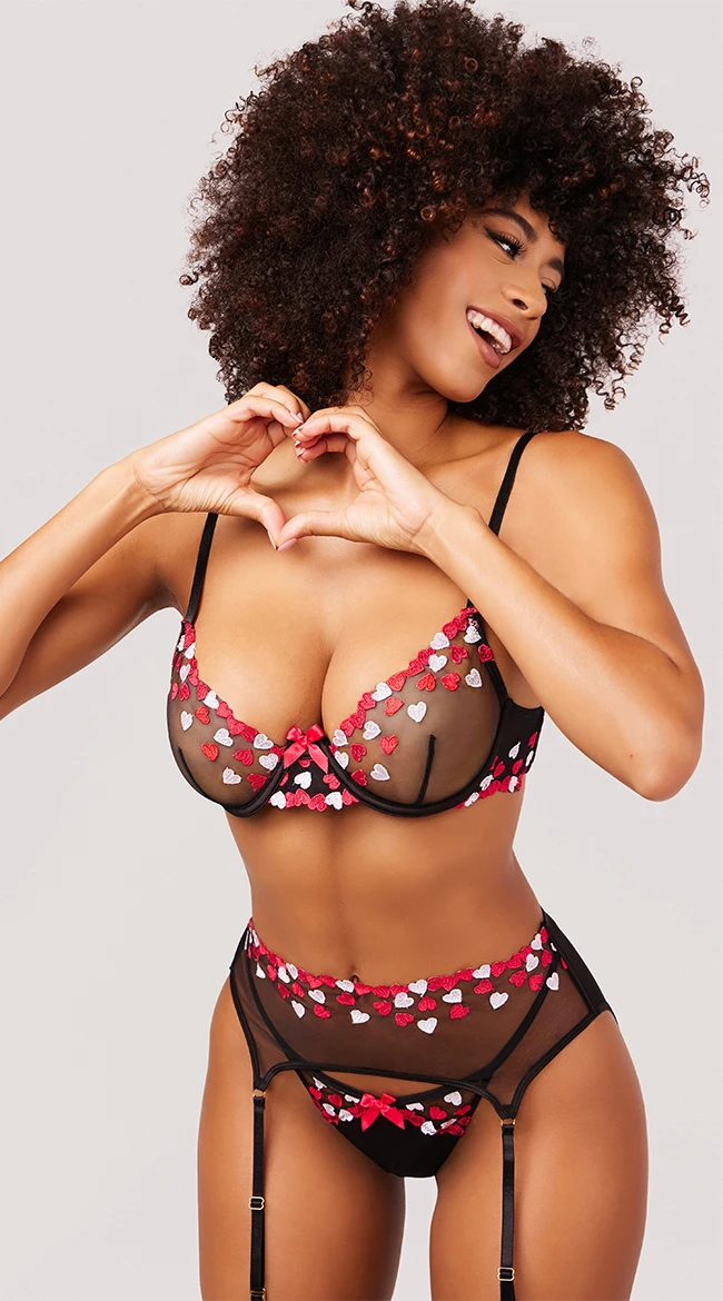 Wear your heart on your lingerie in this exclusive set featuring a mesh bra with sheer underwire cups, red and white heart appliques, adjustable spaghetti straps, a red satin bow accent, a hook and eye back closure, a matching high waisted garter belt with adjustable garter straps and a hook and eye back closure, and a matching panty with a thong cut back. (Thigh high stockings not included.)