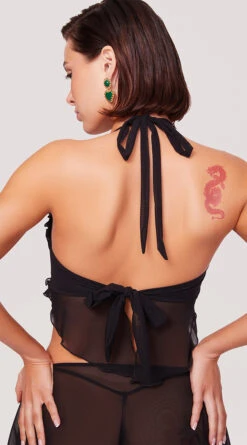 Flash your lover with a sexy surprise in this exclusive bra set featuring sheer mesh cups with an eyelash lace trim, halter straps, a tie back closure, a matching panty with a thong cut back, and a matching sheer robe with a scalloped eyelash lace trim, long sleeves with a lace cuff, and a satin waist belt.